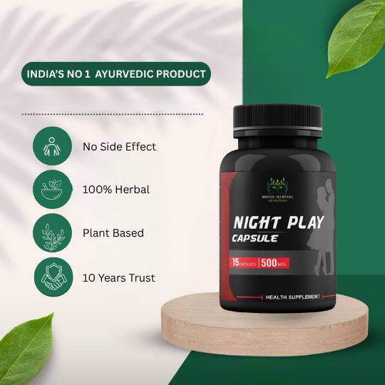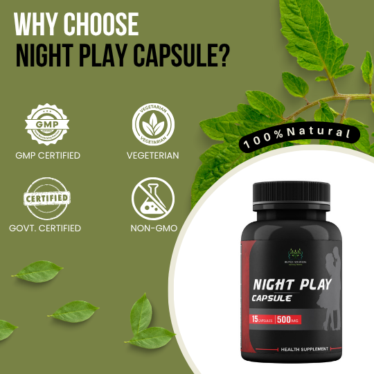 Strategic Ayurvedic Potency for Intimacy: Rooted in centuries of profound Ayurvedic wisdom, Night Play Capsule brings together a precise blend of time-tested herbs renowned for their powerful effects on male sexual health and stamina. Each ingredient is carefully chosen to work synergistically, optimizing your body's natural responses for peak intimate moments.